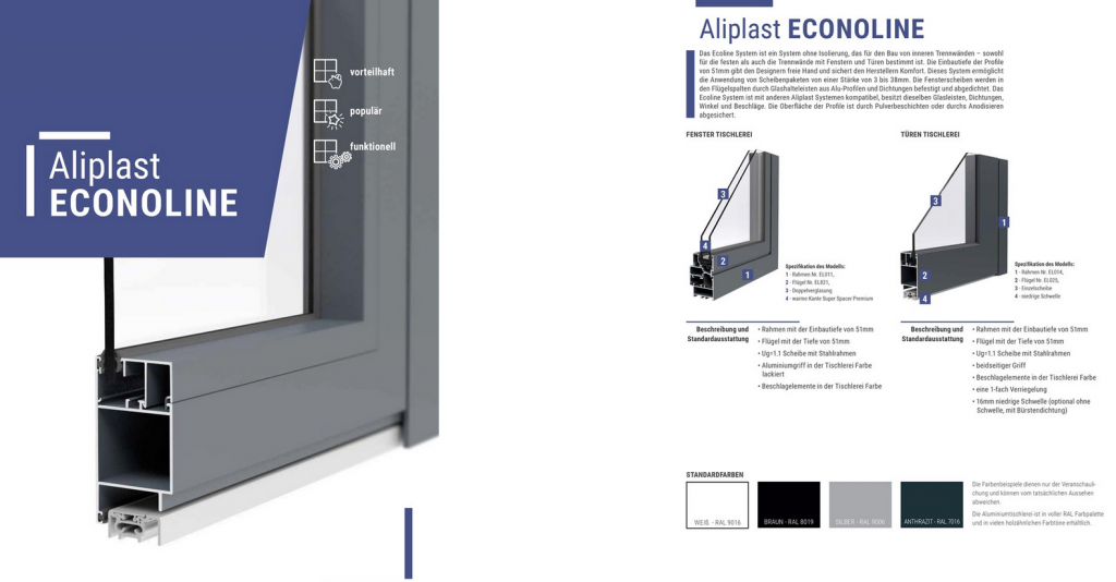 Wie die PVC Produktion ist auch die Aluminium-Tischlerei ein sehr wichtiges Element unseres Unternehmens. In diesem Bereich kooperieren wir mit solchen Herstellern wie Aliplast und Aluprof, deren Lösungen zu den meist ausgebauten und geschätzten im In- und Ausland gehören. Dank der großen Anzahl von Möglichkeiten der Systeme, können wir unseren Kunden praktisch alle technischen Lösungen im Fenster- und Türassortiment, so wie auch in Fassaden- und Wintergartenkonstruktionen, anbieten.